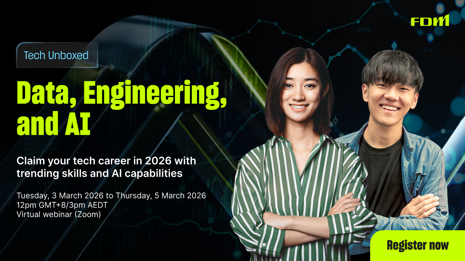 AI will feature in your future tech career—but it can’t generate where you’re headed. Join FDM for Tech Unboxed: Data, Engineering, and AI, a trio of skills-focused webinars designed to show you the clear career paths available with our Data & Analytics and Software Engineering Practices.
