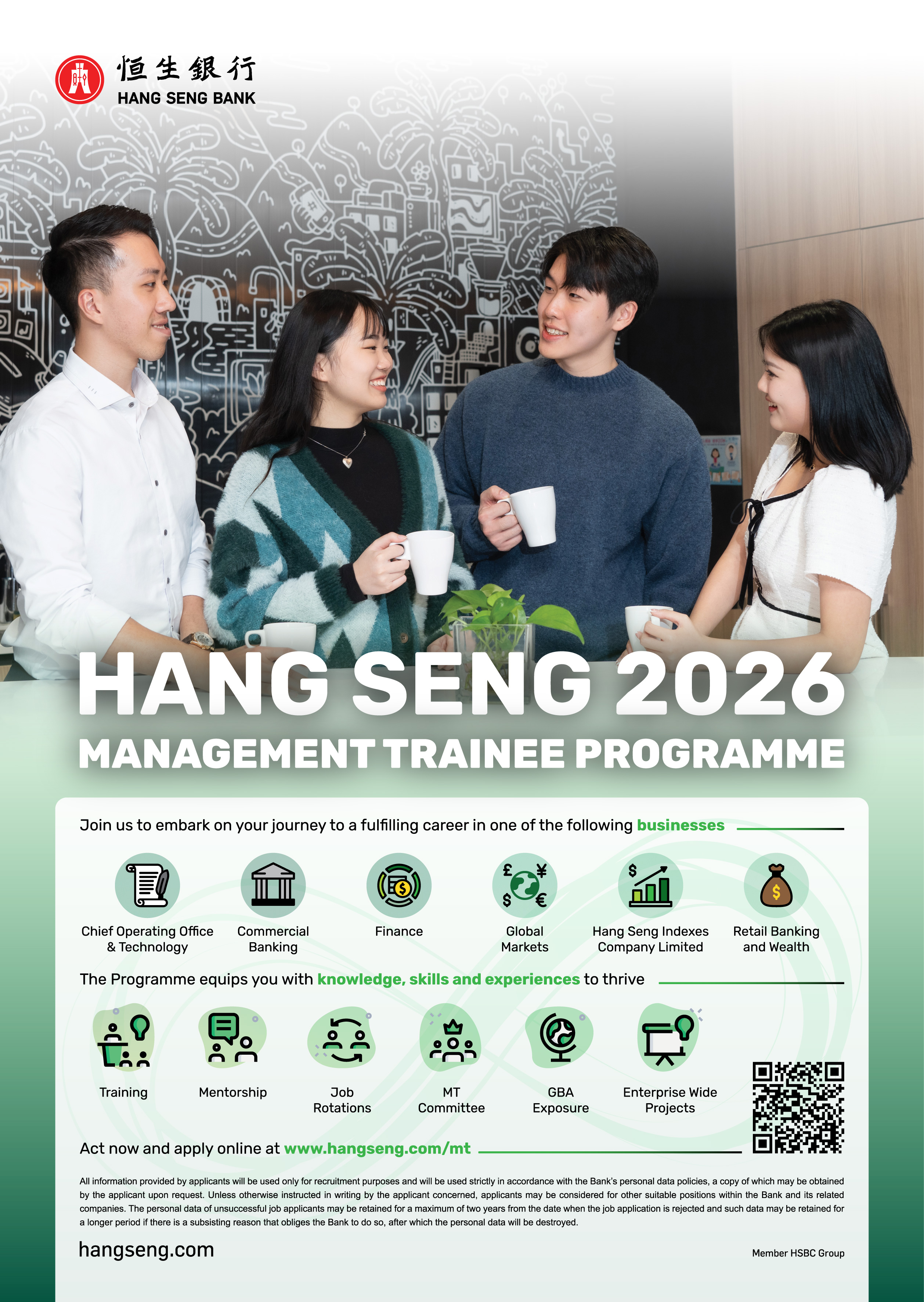 We have been consistently rated as the ‘Best Domestic Bank in Hong Kong’ for over 20 years*. Our sustained business growth underpinned by our purpose-led strategy and values continues to offer new development opportunities for our people. We invite you to join our Management Trainee Programme offering you a holistic development experience encompassing enterprise-wide development and business-specific professional growth.