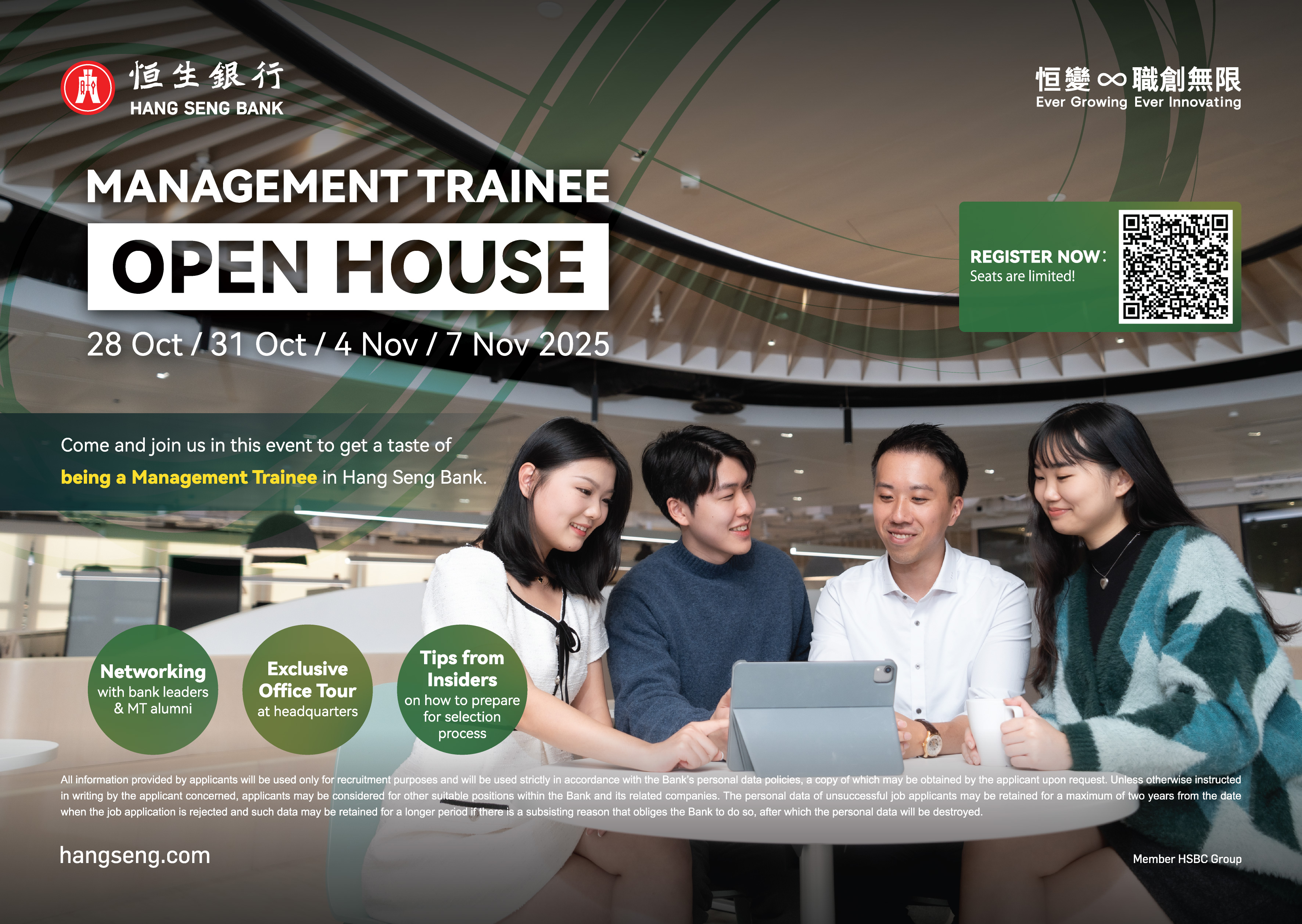 Are you ready to step out from school and kickstart your career journey? Come and join us in the open house event to get a taste of being a Management Trainee (MT) in Hang Seng Bank.
